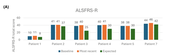Átlagosan a bevont betegek 62,7 hónapja (több, mint 5 éve) éltek ALS-sel a kezelés előtt. A betegek lassan progrediáló ALS-ben szenvedtek (ami definíció szerint havonta <0,9 pontos ALSFRS-R romlással jár), valójában azonban a betegség előrehaladásának mértéke átlagosan -0,36 pont/hó volt. Az átlagos ALSFRS-R pontszámuk a kezelés kezdete előtt 35,1 volt. Másfél év kezelés után ez az érték 36,5 pontra nőtt, vagyis a várható romlás helyett javulás történt a mindennapi funkciók terén. A FIM (Functional Independence Motor) pontszám átlagosan 5,13 ponttal nőtt, ami nagyobb önállóságot jelentett. „Ezeket az eredményeket az ALSFRS-R alapján mért motoros hanyatlás lassulása, a funkció megőrzése, valamint a funkcionális önállóság javulása kísérte” – írták a kutatók.