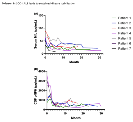 A vizsgálati adatok azt is kimutatták, hogy a kezelés megkezdése után jelentős és tartós csökkenés következett be a neurodegeneráció biomarkereiben, ami arra utal, hogy a terápia mérsékelheti a mozgatóideg-sejtek károsodását. A vérben mért, az idegsejtek pusztulásának mértékét jelző neurofilament könnyűlánc (Nfl) szint a legtöbb betegnél több mint felére csökkent a kezelés első hónapjaiban, majd tartósan az elért alacosnyabb szinten stagnált. Egy másik marker, a foszforilált neurofilament könnyűlánc (pNHF), a liquorban átlagosan 67,6%-kal esett vissza a kezelés hatására.