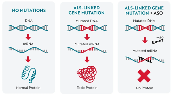 1 . ábra. A Qalsody (tofersen) hatásmechanizmusa. A bal oldali ábrán látható a normális élettani helyzet. A középső ábrán egy kezelésben nem részesülő, SOD1 mutációt hordozó beteg esete látható: A mutációt hordozó génről egy igen stabil, a lebontásnak ellenálló fehérjetermék képződik. A jobb oldali ábrán látható a Qalsody kezelés (az ábrán ASO-ként jelölve) hatása: még mielőtt fehérje képződne, a gyógyszer megakadályozza a fehérjetermék képződését, így nem keletkezik ez a lebontásnak ellenálló toxikus fehérje.
